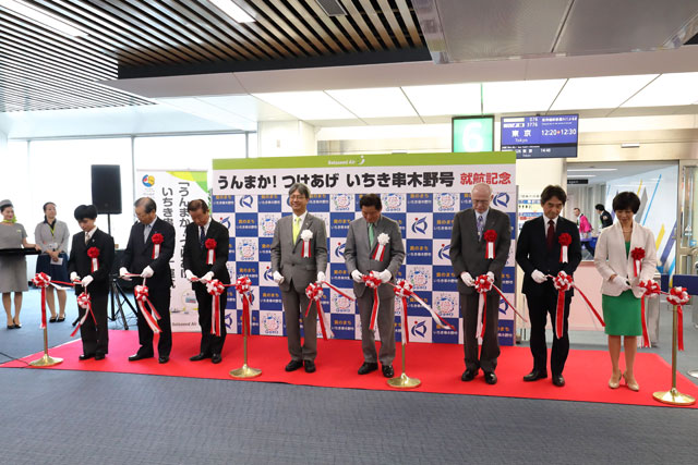 鹿児島空港で開かれたソラシドのいちき串木野号就航式典でテープカットする髙橋社長ら=18年9月1日 PHOTO: Masahiro SATO/Aviation Wire
