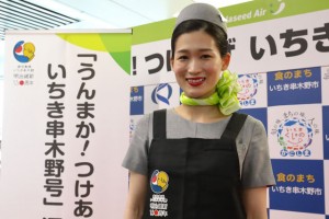 機内では、客室乗務員がオリジナルデザインのエプロンを着用。シートポケットには情報誌を置き、共同でピーアール活動を展開する。
