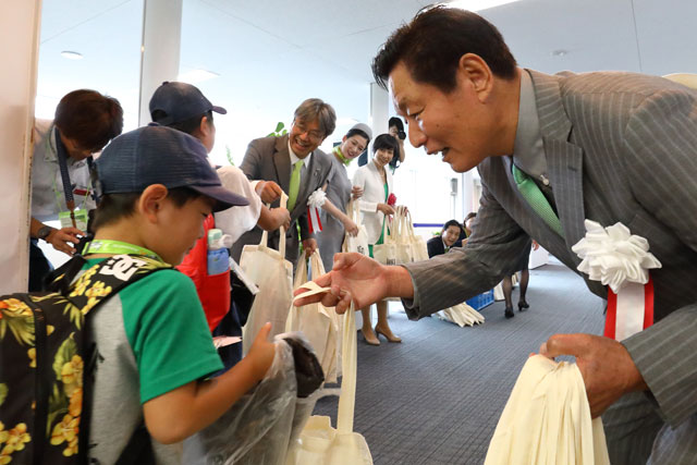 鹿児島空港でソラシドのいちき串木野号初便の乗客に記念品を手渡すいちき串木野市の田畑市長=18年9月1日 PHOTO: Masahiro SATO/Aviation Wire