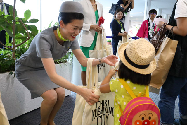 鹿児島空港でいちき串木野号初便の乗客に記念品を手渡すソラシドエアの客室乗務員=18年9月1日 PHOTO: Masahiro SATO/Aviation Wire