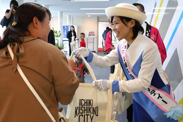 鹿児島空港でソラシドのいちき串木野号初便の乗客に記念品を手渡すいちき串木野PRレディーの前川綾女さん=18年9月1日 PHOTO: Masahiro SATO/Aviation Wire