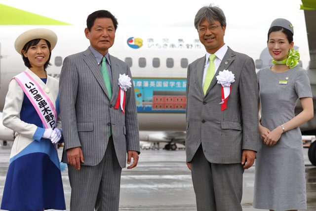鹿児島空港でいちき串木野号の前に並ぶいちき串木野市の田畑市長(中央左)とソラシドエアの髙橋社長(中央右)、客室乗務員(右)、いちき串木野PRレディーの前川綾女さん=18年9月1日 PHOTO: Masahiro SATO/Aviation Wire