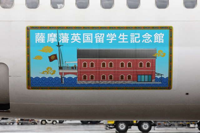 機体のロゴマークをデザインした、市内にある神村学園高等部の榎田尚人さんもイベントに招かれた。明治維新150周年を記念したオリジナルロゴを市が制作する際、市内3高校の生徒から希望者を募り、選ばれた12人が工夫を凝らしたロゴをデザインした。市によると、完成度の高さや制作意図を自身の言葉で語り、選考者の気持ちをとらえたことから、榎田さんの作品が選ばれたという。