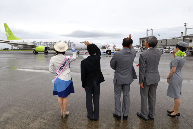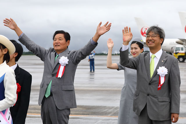 鹿児島空港を離陸したソラシドのいちき串木野号羽田行き初便を見送る田畑市長(左)と髙橋社長ら=18年9月1日 PHOTO: Masahiro SATO/Aviation Wire