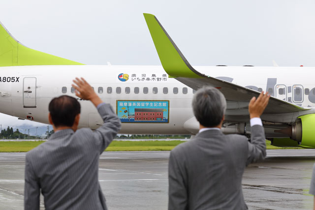 田畑市長(左)や髙橋社長らに見送られて鹿児島空港を出発するソラシドのいちき串木野号羽田行き初便=18年9月1日 PHOTO: Masahiro SATO/Aviation Wire