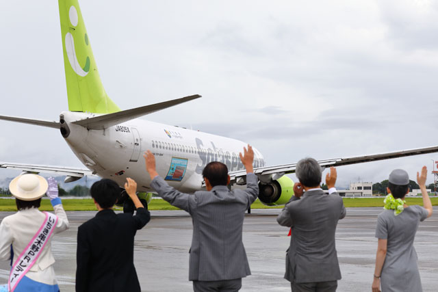 田畑市長や髙橋社長らに見送られて鹿児島空港を出発するソラシドのいちき串木野号羽田行き初便=18年9月1日 PHOTO: Masahiro SATO/Aviation Wire
