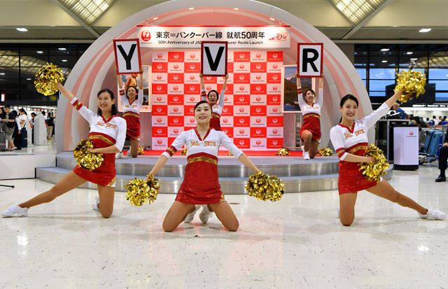 日本航空(JAL/JL、9201)は9月10日、東京-バンクーバー線就航50周年式典を成田空港で開いた。バンクーバー行きJL18便の乗客には記念品が配られたほか、出発ロビーでは現役客室乗務員によるチアダンスチーム「JAL JETS」のメンバーが、バンクーバー国際空港の3レター(3文字)コード「YVR」の看板などを手に、パフォーマンスを披露して華を添えた。