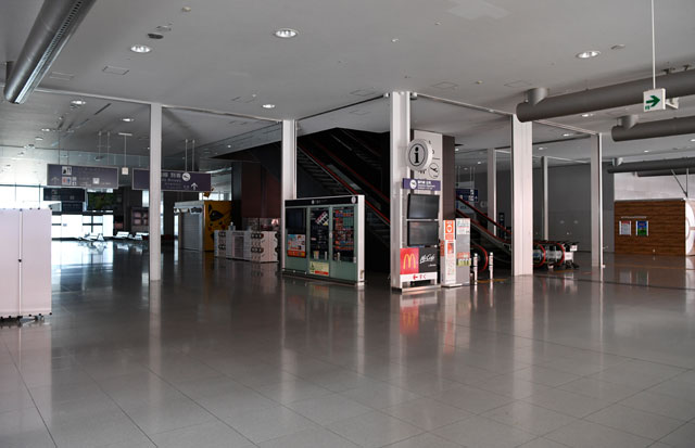 しばらくして2タミに着くと、国内線エリアはコンビニが営業しており、チェックイン機で搭乗手続きをする人の姿があった。1994年9月4日の開港時から運用している1期島と、2007年8月2日に供用を開始し、現在2タミがある2期島は、台風の被害状況も大きな差があり、まずは2タミから運用再開となった。1タミはPBB(搭乗橋)なども被害を受けており、暫定運用を開始後も、完全復旧までは時間がかかりそうだ。