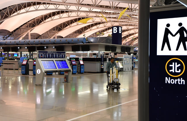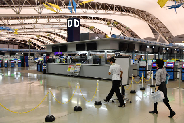 関空第1ターミナル北エリアで再開準備を進める航空会社の係員=18年9月20日 PHOTO: Tadayuki YOSHIKAWA/Aviation Wire