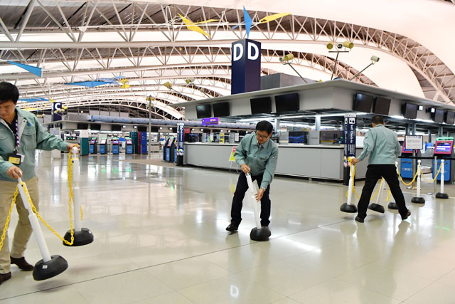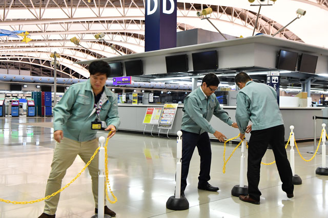 関空第1ターミナル北エリアで再開準備を進める大韓航空の係員=18年9月20日 PHOTO: Tadayuki YOSHIKAWA/Aviation Wire