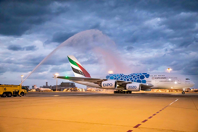 関西線への投入初日のエミレーツ航空A380特別塗装機(同社提供)