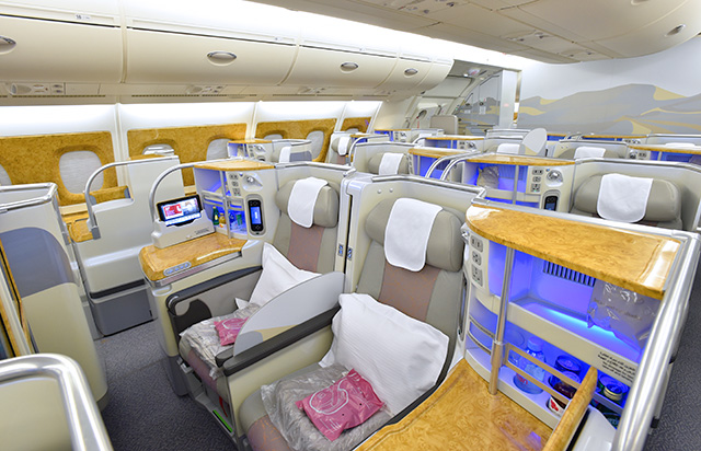 エミレーツ航空の日本路線は、関空と成田、羽田の3路線で、このうち成田には2017年3月26日から、A380を3年9カ月ぶりに再就航させた。羽田には、ドイツの高級車「メルセデス・ベンツ」Sクラスから着想を得たデザインのファーストを導入する777-300ER(3クラス354席:ファースト6席、ビジネス42席、エコノミー306席)を投入している。