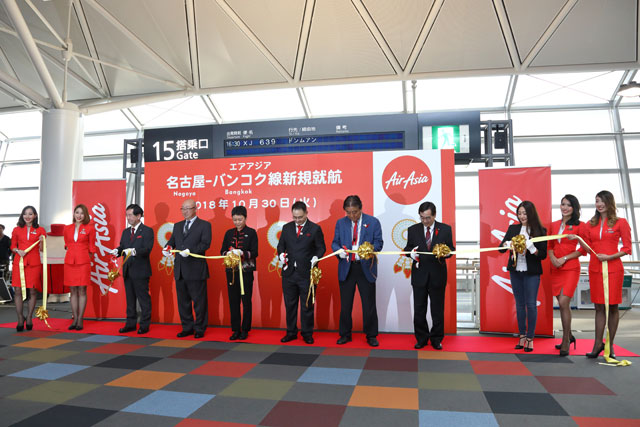 中部空港で開かれた就航式典でテープカットするタイ・エアアジアXのブラナシリCEOら=18年10月30日 PHOTO: Masahiro SATO/Aviation Wire