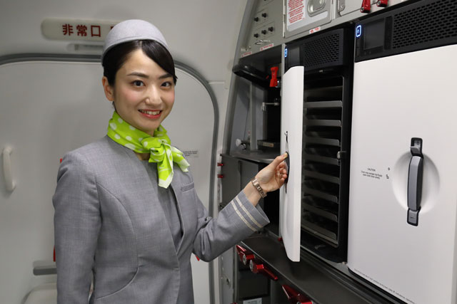 737-800新仕様機のギャレーに設けられたオーブンを紹介するソラシドの客室乗務員=18年10月31日 PHOTO: Masahiro SATO/Aviation Wire