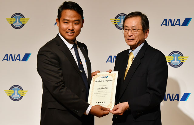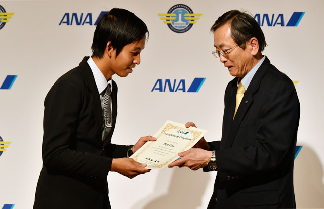 ANAホールディングスの篠辺副会長から修了証を授与されるミャンマーからのグラハン研修生=18年11月26日 PHOTO: Tadayuki YOSHIKAWA/Aviation Wire