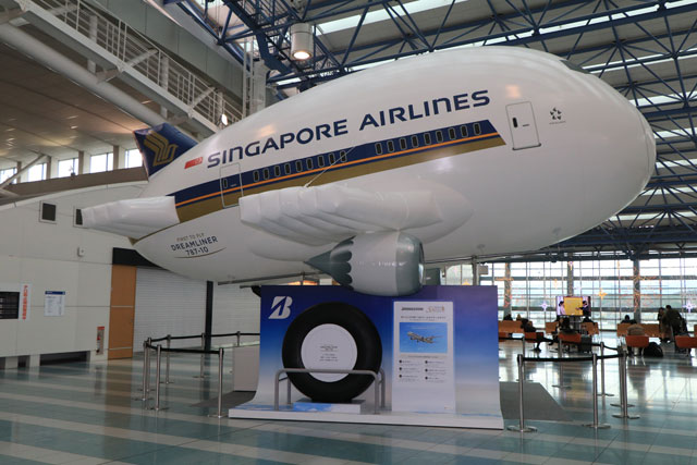 福岡空港に飾られたシンガポール航空の787-10をイメージした風船=18年12月9日 PHOTO: Youichi KOKUBO/Aviation Wire