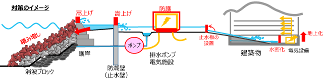 止水板の設置や大型ポンプ車の配備などは、直ちに導入する。防潮壁のかさ上げなどは2019年度末までに、電気設備の地上化は2020年度中、護岸のかさ上げなどは2020年度以降に導入する。