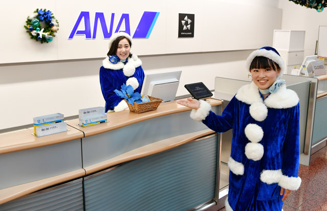 ・ANA、青いサンタがお出迎え 羽田でロゴ入りイヤホンをプレゼント(15年12月4日)