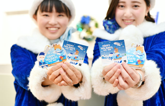・ANA、ブルーサンタが出迎え 羽田空港でタグやシールプレゼント(17年12月23日)