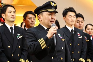 羽田第1ターミナルで合唱を披露前に事業改善命令を受けたことを謝罪する織田機長=18年12月24日 PHOTO: Masahiro SATO/Aviation Wire