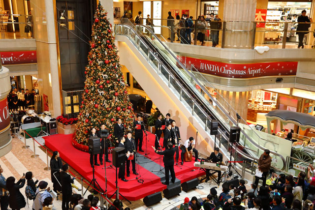 羽田第1ターミナルで合唱を披露するJAL空飛ぶ合唱団のメンバー=18年12月24日 PHOTO: Masahiro SATO/Aviation Wire
