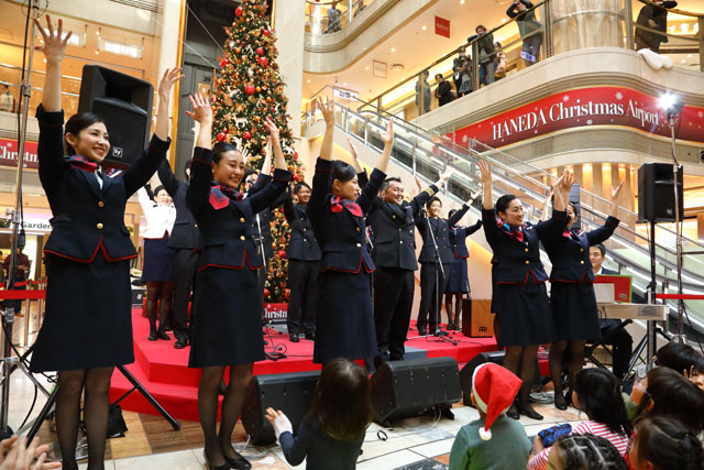 ・JALのCAとパイロット、羽田でミュージックベルや合唱披露 手話も交えクリスマス公演(18年12月25日)