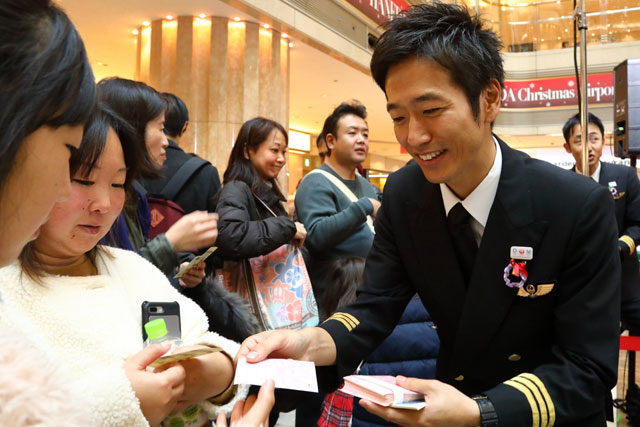 羽田第1ターミナルでの合唱を終え子供にシールを手渡すパイロット=18年12月24日 PHOTO: Masahiro SATO/Aviation Wire