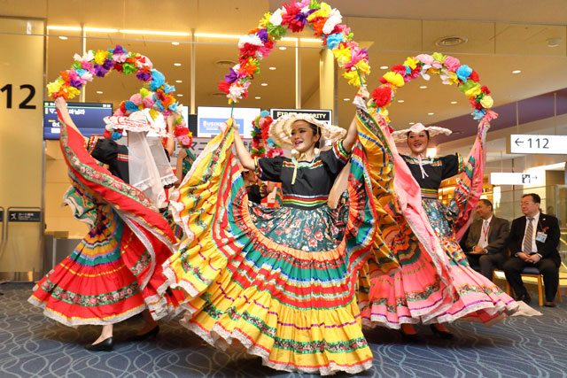 JALの羽田-マニラ線就航記念式典で民族舞踊を披露する東京外国語大学の学生