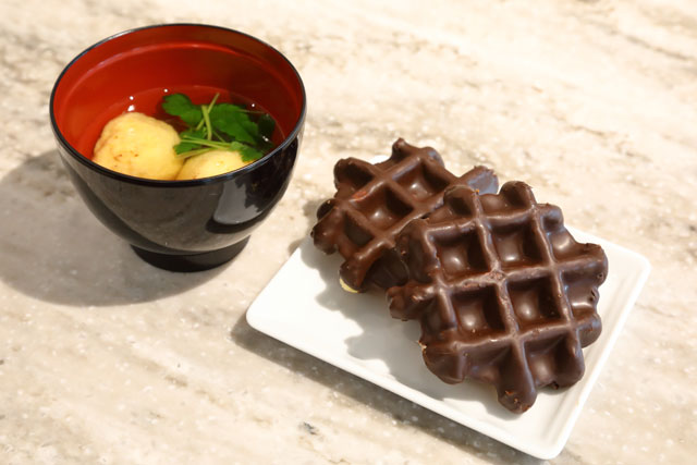 リニューアルオープンした伊丹空港のANAスイートラウンジで提供される明石焼き(左)とワッフル=19年1月30日 PHOTO: Masahiro SATO/Aviation Wire