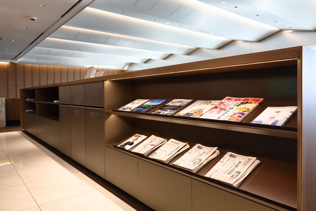 リニューアルオープンした伊丹空港のANAスイートラウンジのマガジンラック=19年1月30日 PHOTO: Masahiro SATO/Aviation Wire