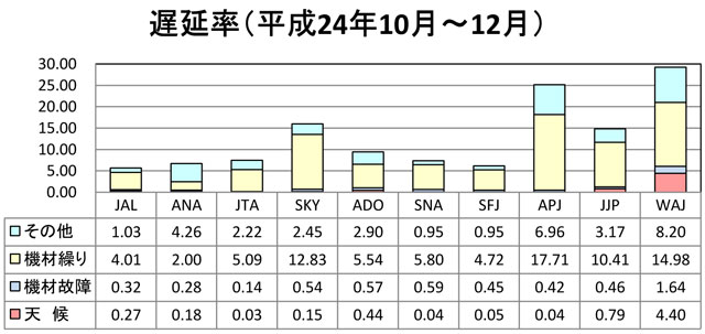航空輸送サービスに係る情報公開12年10月から12月期の遅延率(国交省の資料から)