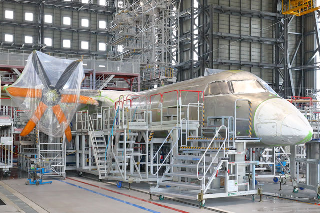 MROジャパンの大型ドックでリペイント中のANAウイングスのQ400=PHOTO: Masahiro SATO/Aviation Wire