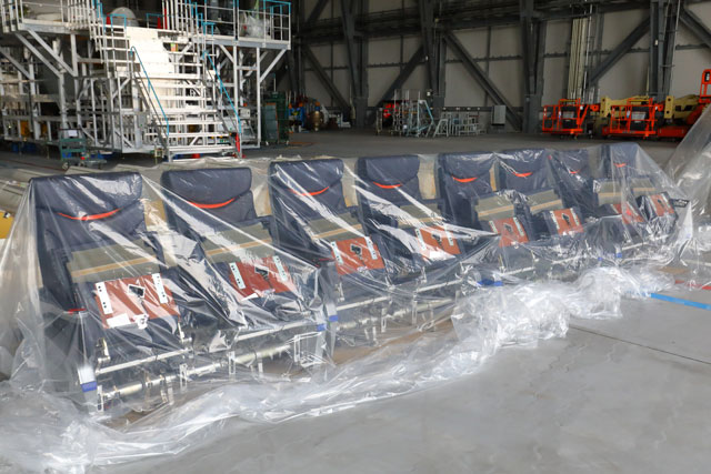 MROジャパンの小型ドックでC整備を受けるANAの737-800から取り外したプレミアムクラス用シート=PHOTO: Masahiro SATO/Aviation Wire