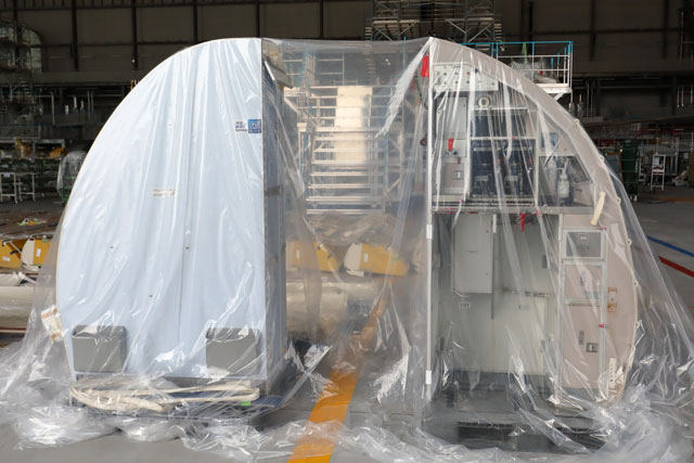 MROジャパンの小型ドックでC整備を受けるANAの737-800から取り外したギャレーエリアのユニット=PHOTO: Masahiro SATO/Aviation Wire