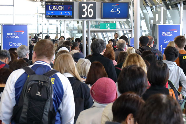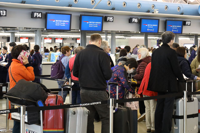 関西空港のチェックインカウンターに並ぶブリティッシュ・エアウェイズのロンドン行き初便の乗客=19年4月1日 PHOTO: Masahiro SATO/Aviation Wire