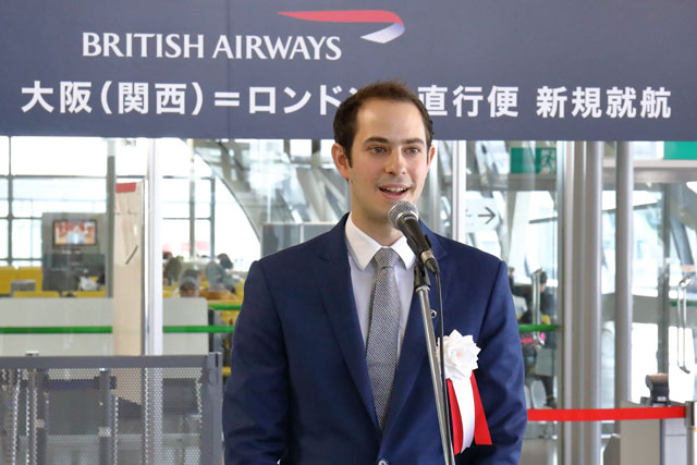 関西空港の初便就航式典であいさつするブリティッシュ・エアウェイズのバージャー支配人=19年4月1日 PHOTO: Masahiro SATO/Aviation Wire