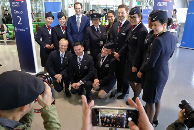関西空港の初便就航式典で記念撮影するブリティッシュ・エアウェイズのバージャー支配人と初便のクルー=19年4月1日 PHOTO: Masahiro SATO/Aviation Wire