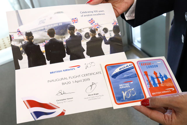 ブリティッシュ・エアウェイズ(BAW/BA)はロンドン-関西線を現地時間3月31日に開設し、初便が4月1日に関西空港へ到着した。ロンドンと関空を結ぶ唯一の直行便で、10年前に日本航空(JAL/JL、9201)が運休して以来の路線復活となり、ブリティッシュ・エアウェイズとしては20年ぶりに再就航した。