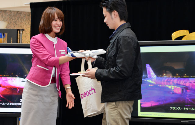 関西空港を拠点とするAPJが、関東地方でイベントを開催するのは今回で2回目。4月12日からは関西-仙台線を開設し、札幌を除くと初めて東日本へ就航する。会場ではAPJの機内販売商品やエアバスA320型機の模型など、両社のグッズが当たる抽選会が行われた。