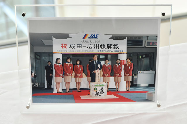 現在投入している787-8の座席数は、2クラス206席(ビジネス30席、エコノミー176席)。就航20周年式典は、5日が清明節にあたることから4日に実施し、この日の羽田発広州行きJL87便(787-8、登録記号JA829J)は、乗客136人を乗せ定刻より2分早い午前8時48分に出発した。