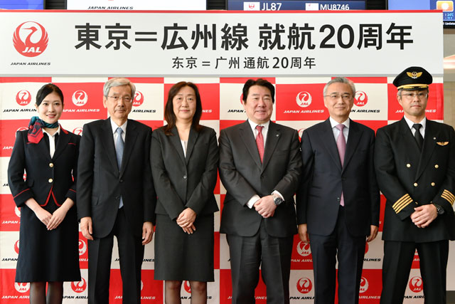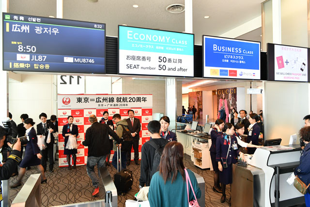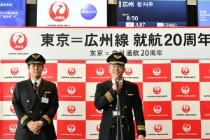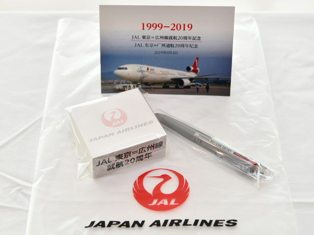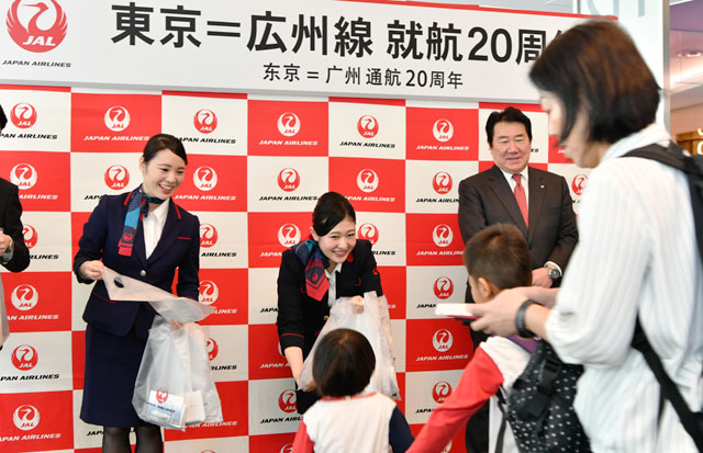 日本航空(JAL/JL、9201)は4月4日、東京-広州線就航20周年記念式典を羽田空港で開いた。広州行きJL87便の乗客には、搭乗記念証やボールペンなどの記念品が手渡された。