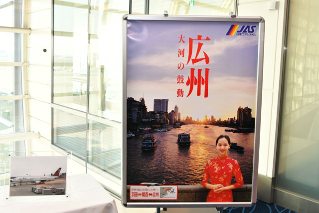 羽田空港の搭乗口前に飾られたJASの広州線ポスター=19年4月4日 PHOTO: Tadayuki YOSHIKAWA/Aviation Wire