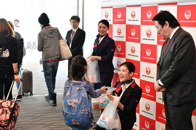 羽田空港で広州行きJL87便に搭乗する子供に就航20周年の記念品を手渡すJALの客室乗務員=19年4月4日 PHOTO: Tadayuki YOSHIKAWA/Aviation Wire
