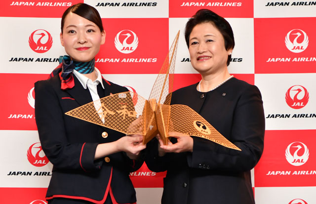 JL501便に乗務した客室乗務員は、青戸和美さん、秋元和香菜さん、浅沼和恵さん、西和音さん、松原令実さんの5人。乗客には搭乗証明書のほか、七宝文様を採用した和鶴がプレゼントされた。JALによると、七宝柄は日本古来の文様で、円形が永遠に連鎖してつながる柄が円満や調和、縁などを表わす縁起の良いものだという。