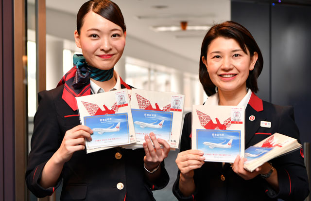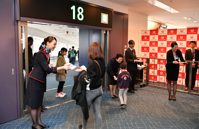 羽田空港で令和祝賀フライトとなったJL501便に搭乗する乗客に記念品を手渡す客室乗務員ら=19年5月1日 PHOTO: Tadayuki YOSHIKAWA/Aviation Wire