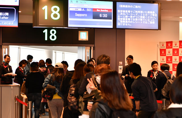 羽田空港で令和祝賀フライトとなったJL501便に搭乗する乗客=19年5月1日 PHOTO: Tadayuki YOSHIKAWA/Aviation Wire