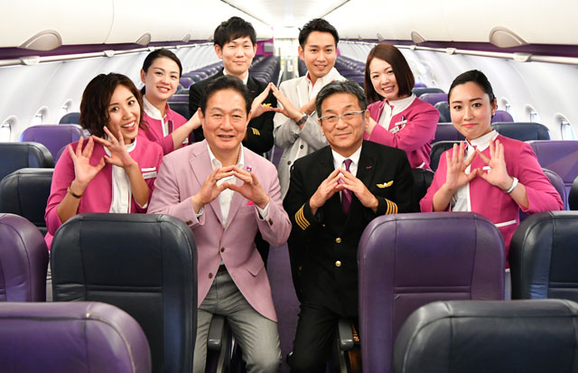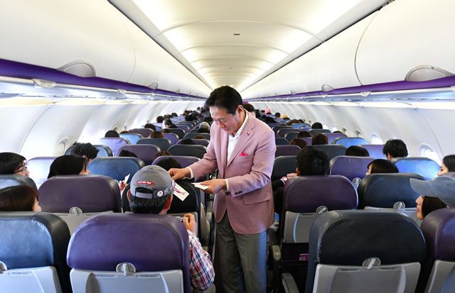 MM158便にはピーチの井上慎一CEO(最高経営責任者)や、2012年3月1日の関西-福岡線初便を担当した岡恒(おか・ひさし)機長と客室乗務員の荒本真麻さん、パシオン麗美さんも乗務。井上CEOは機内で、客室乗務員がメッセージを書いたJA801Pのステッカーを、乗客ひとり一人に手渡していた。