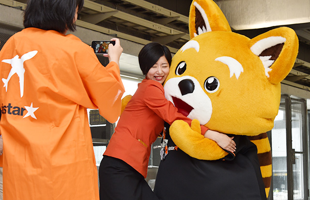 ジェッ太に抱きつくジェットスターの地上係員(中)=19年5月14日 PHOTO: Yusuke KOHASE/Aviation Wire