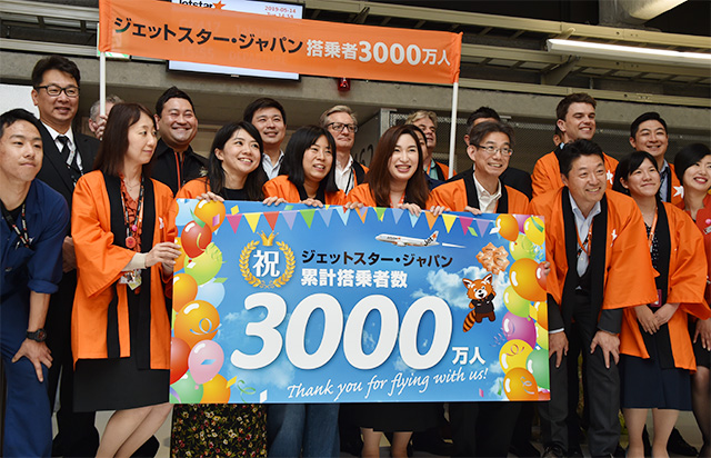 ジェットスター・ジャパン(JJP/GK)は5月13日に、累計搭乗者数が3000万人に到達した。2012年7月の就航から6年10カ月での達成となった。14日は3000万人突破イベントを成田空港で開き、同社の片岡優社長ら社員有志約30人が利用客を見送った。