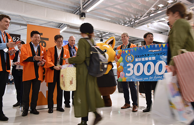 3000万人到達便となったのは、13日の札幌発成田行きGK116便。14日の成田発高松行きGK417便(エアバスA320型機、登録記号JA24JJ)を記念便として運航し、片岡社長のほかパイロットや地上係員、整備士ら社員有志が利用客を見送った。イベントには、同社マスコットの“ジェッ太”も参加した。